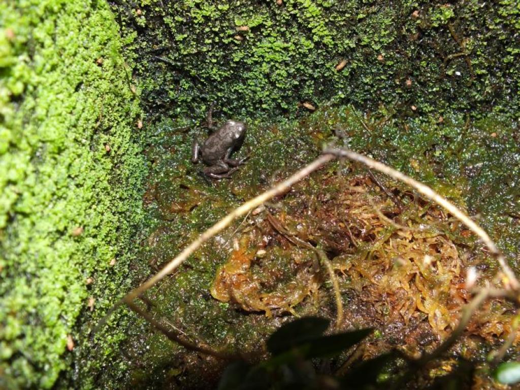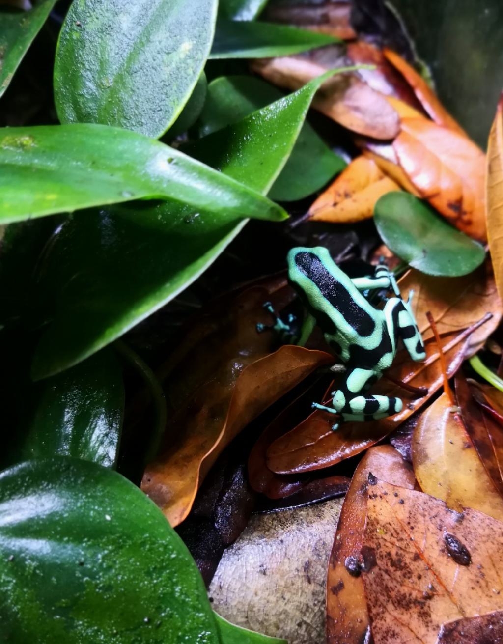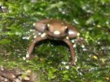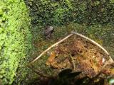 ![]() Abb.2: Die Vogelspinne Sericopelma rubronites hat einen D. auratus erbeutet und zieht sich zur Verdauung in ihren Unterschlupf zurück. © 2005 Thomas Ostrowski |