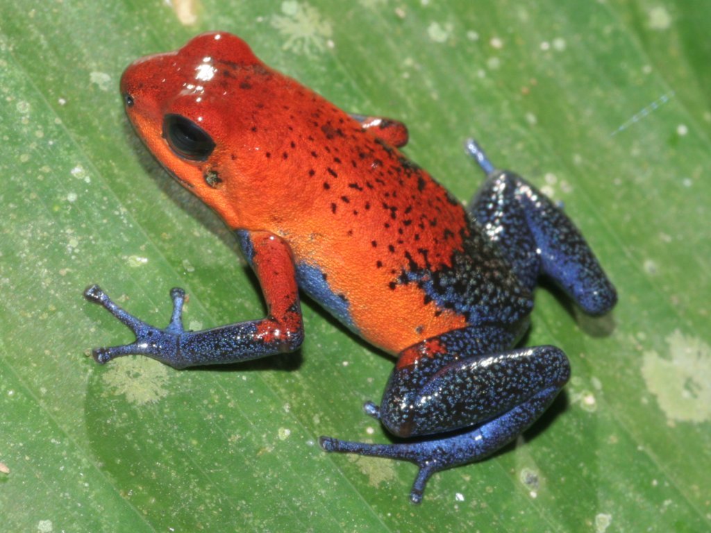Abb.: Häutung von Oophaga cf. typographa. Wie alle Anuren häuten sich auch Dendrobatidae in regelmäßigen Abständen. Die Haut wird anschließend verzehrt.